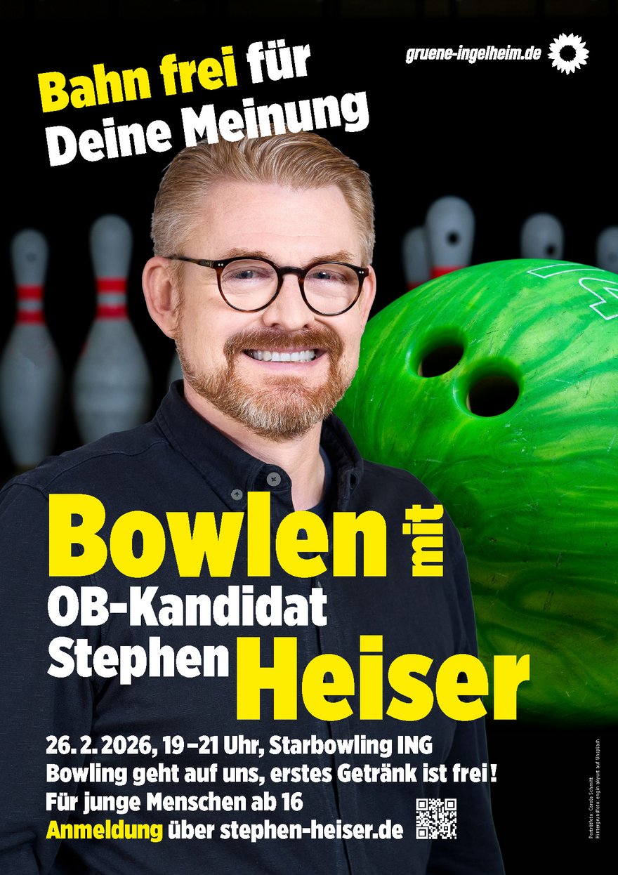 Junge Menschen wissen am besten, was in unserer Stadt gut läuft – und wo es hakt. Genau darüber möchte ich mit Euch ins Gespräch kommen. Deshalb lade ich herzlich ein, gemeinsam bowlen zu gehen und ganz entspannt über Eure Themen, Ideen und Herausforderungen zu sprechen. Kein Podium, keine langen Reden, sondern Austausch auf Augenhöhe. Bowling und das erste Getränk gehen auf uns. Wenn Du 16 oder älter bist und Lust hast, Deine Perspektive einzubringen und dabei eine gute Zeit zu haben, melde Dich hier an – Ich freue mich auf Dich.