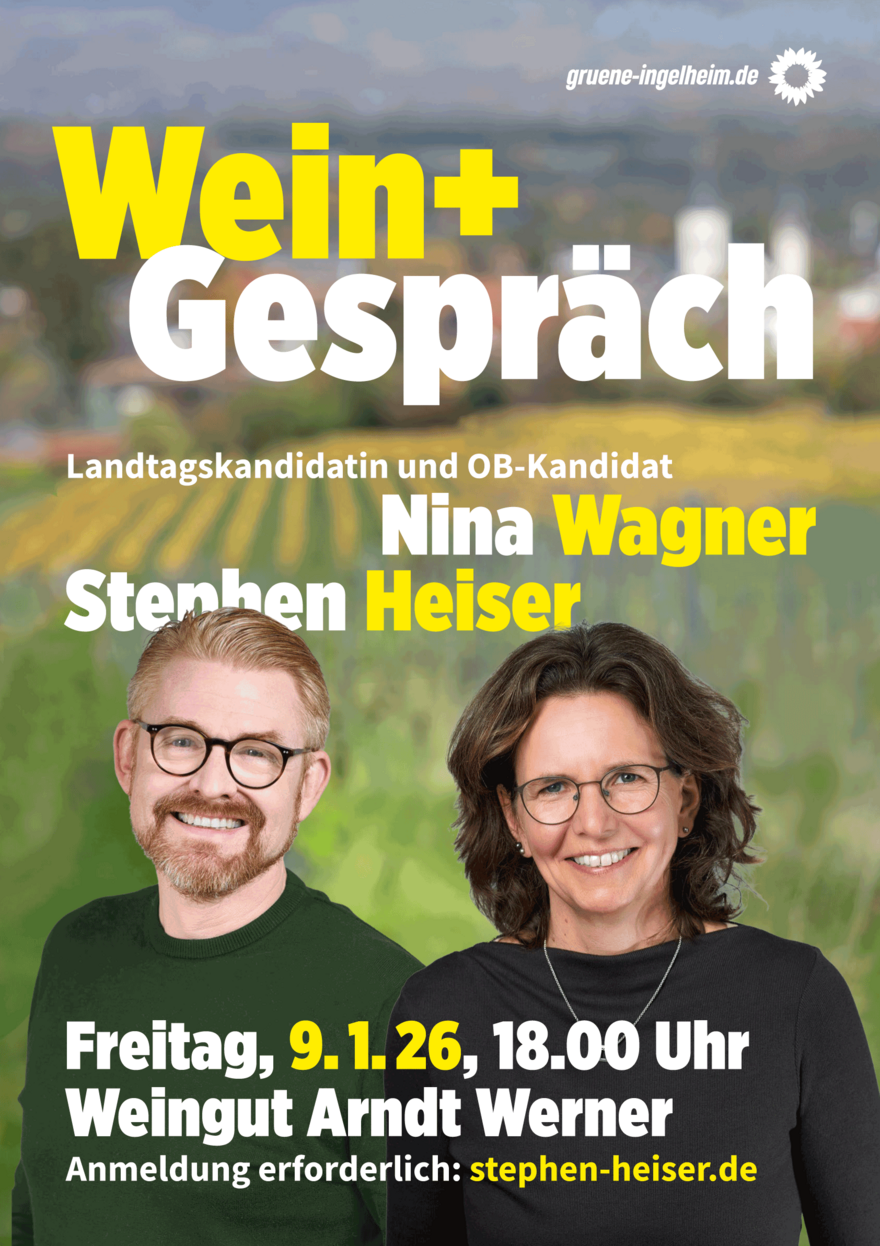Spannende politische Ideen verbinden mit geschmackvollen Inhalten im Weinglas, das ist die Idee hinter dem „Politischen WeINGgespräch“, das unser Ortsverband (OV) Ingelheim von Bündnis90/Die Grünen am 9. Januar 2026 im Weingut Arndt Werner veranstaltet. Welche Ziele und Ideen verfolgt unser Kandidat Stephen Heiser für die Oberbürgermeisterwahl in der Rotweinstadt? Mit welchen Themen möchte Nina Wagner, unsere Kandidatin der GRÜNEN in Ingelheim, Nieder-Olm und Budenheim für die Landtagswahl (beide Wahlen am 22. März 2026) Rheinland-Pfalz voran bringen?