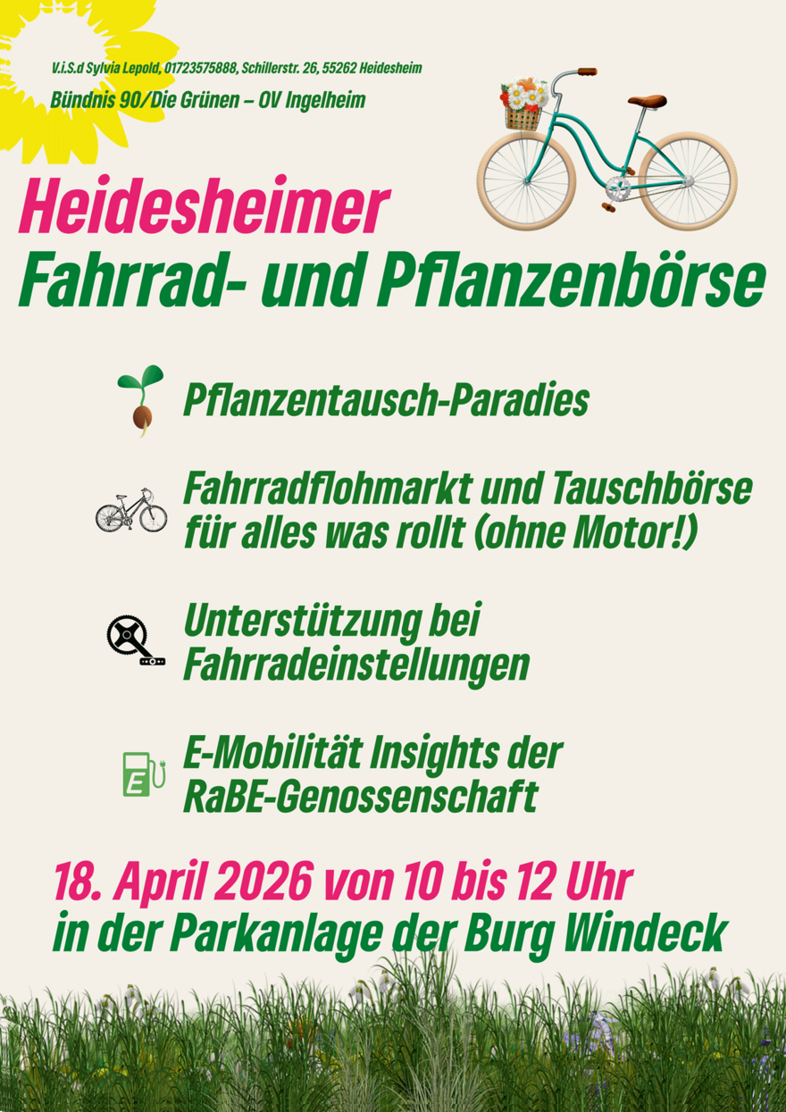 Unser grüner Ortsverband Ingelheim freut sich, in 2026 wieder die alljährliche Pflanzen- und Fahrradbörse im Park der Burg Windeck in Heidesheim anzukündigen. Termin ist Samstag, der 18. April, von 10.00 bis 12.00 Uhr und bietet Bürger:innen die Möglichkeit, Pflanzen und umweltfreundliche Fortbewegungsmittel zu tauschen, zu kaufen oder zu verkaufen.